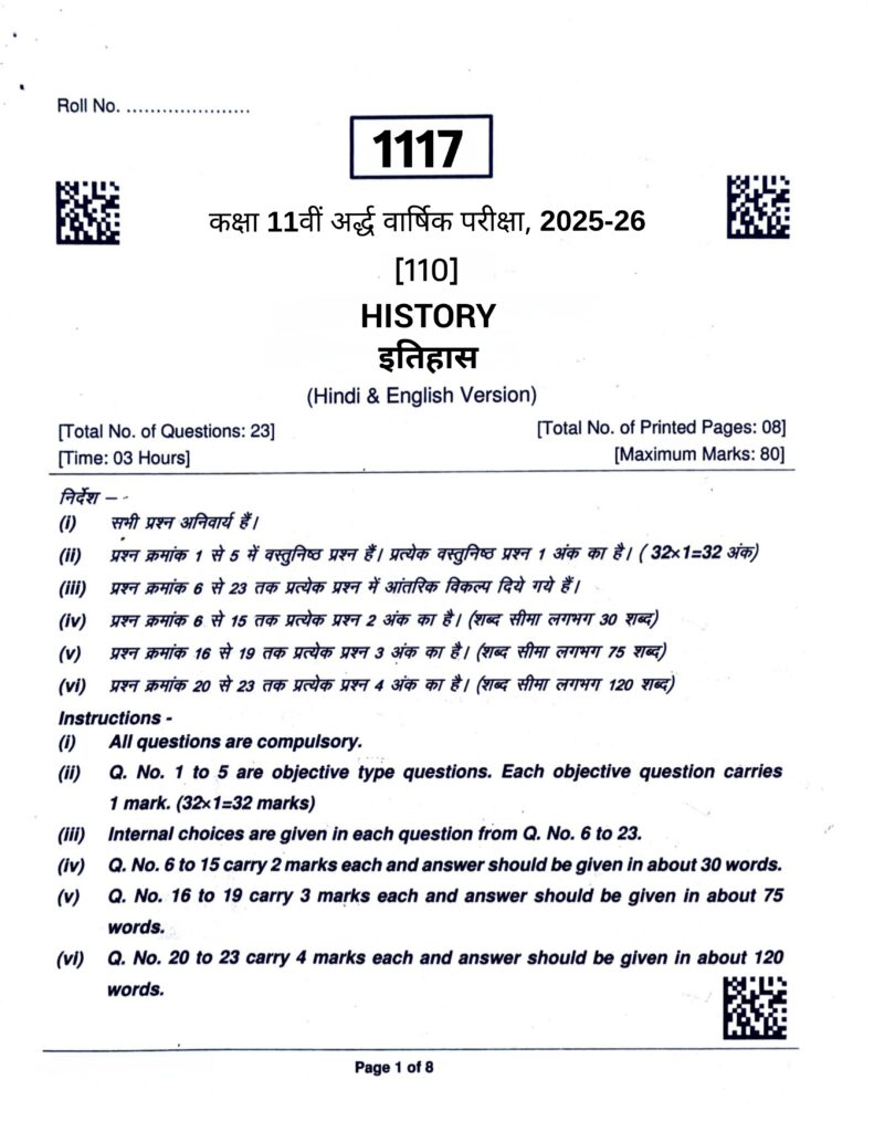 Class 11th History Ardhvaarshik paper pdf Download 2025 | Class 11th Itihaas Ardhvaarshik paper pdf Download