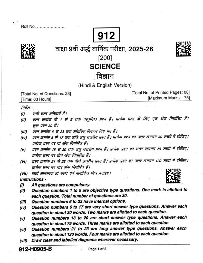 class 9th Science half yearly paper 2025-26 | ardhvarshik pariksha 2025-26 Class 9th Science | Kaksha 9 Science ardhvaarshik paper pdf Download