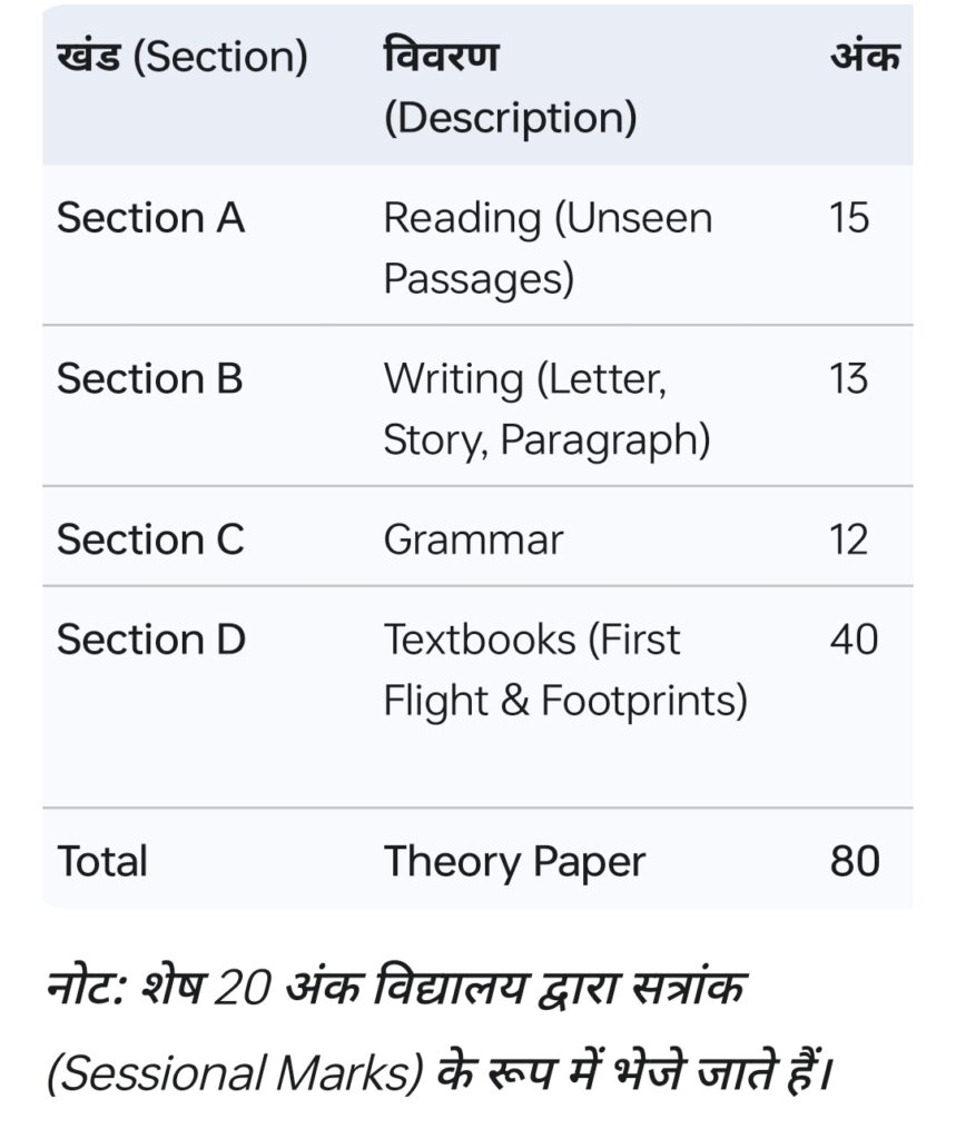 5. समय प्रबंधन (Time Management)बोर्ड परीक्षा में 3 घंटे 15 मिनट का समय मिलता है। इसे इस प्रकार विभाजित करें: * प्रथम 15 मिनट: पेपर को ध्यान से पढ़ने के लिए। * 45 मिनट: Section A (Passages) के लिए। * 45 मिनट: Section D (Books) के लिए। * 40 मिनट: Section B (Writing) के लिए। * 20 मिनट: Section C (Grammar) के लिए। * अंतिम 15 मिनट: उत्तर पुस्तिका की समीक्षा (Revision) के लिए।